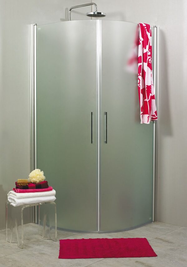 Kaarjas kahe uksega matt klaasidega dušinurk.